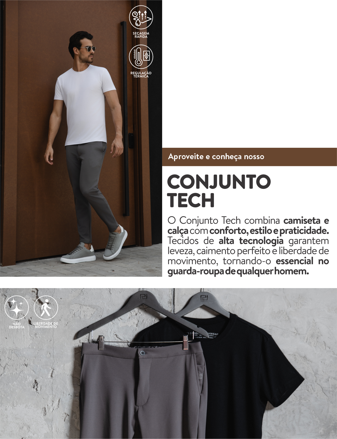 A Calça Tech Alfaiataria Podium combina o visual refinado da alfaiataria com o conforto dos tecidos tecnológicos.